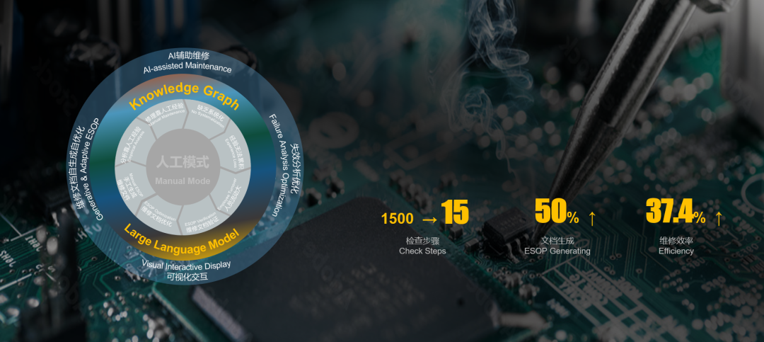 基于知識(shí)圖譜推理與ESOP流程優(yōu)化等算法,結(jié)合知識(shí)圖譜與大模型的協(xié)同增強(qiáng),賦予了維修AI專業(yè)知識(shí)推理的能力。通過(guò)輸入待維修主板的問(wèn)題描述,讓系統(tǒng)了解主板的可能故障所在,結(jié)合實(shí)時(shí)交互和流程優(yōu)化,針對(duì)性地給出每一步的檢測(cè)步驟指導(dǎo),從而提供快速而精準(zhǔn)的故障診斷解決方案。實(shí)際應(yīng)用中,維修人員能夠跳過(guò)無(wú)關(guān)步驟,更快速、準(zhǔn)確地找到故障原因,并采取有效措施進(jìn)行修復(fù)。UPPH(單位時(shí)間產(chǎn)出)提升了37.4%,維修效率得到了顯著提高。
