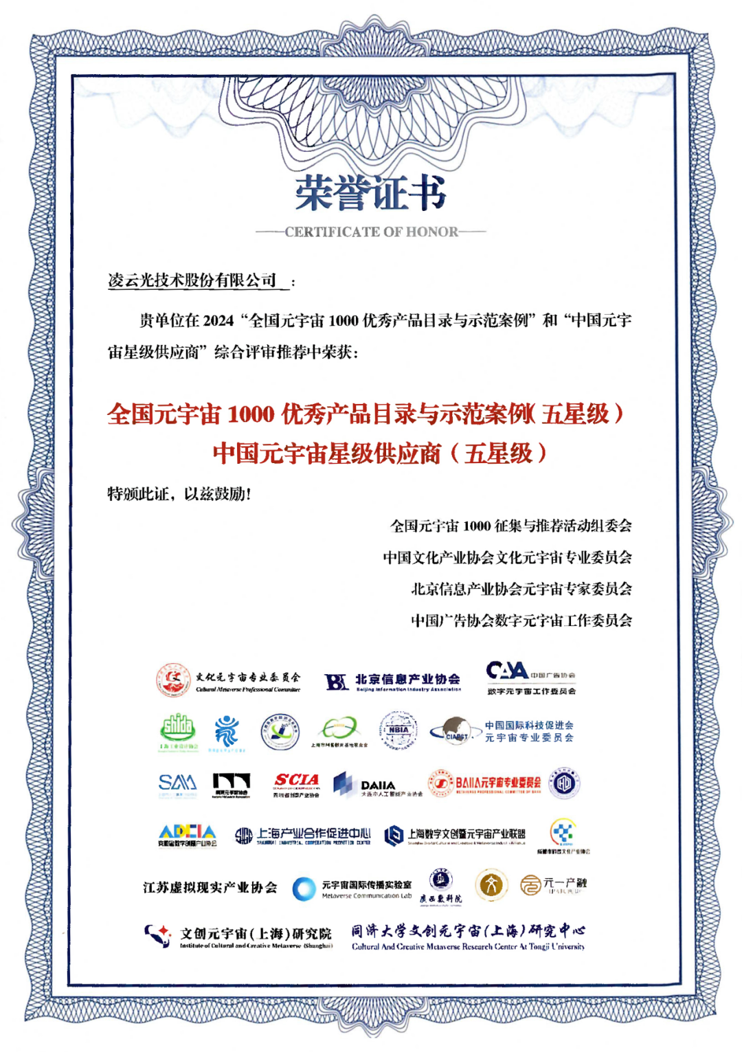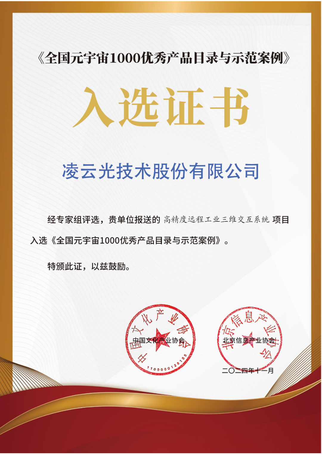 在由中國文化產(chǎn)業(yè)協(xié)會(huì)等多家單位聯(lián)合主辦的“2024全國元宇宙產(chǎn)業(yè)供需對(duì)接大會(huì)”上,經(jīng)過嚴(yán)格的評(píng)審與星級(jí)推薦,僅有12家單位獲評(píng)五星級(jí),凌云光憑借在元宇宙領(lǐng)域的前沿探索與創(chuàng)新成果從眾多參評(píng)單位中脫穎而出,榮獲全國元宇宙1000優(yōu)秀產(chǎn)品目錄與示范案例(五星級(jí))以及2024中國元宇宙星級(jí)供應(yīng)商(五星級(jí))榮譽(yù)。