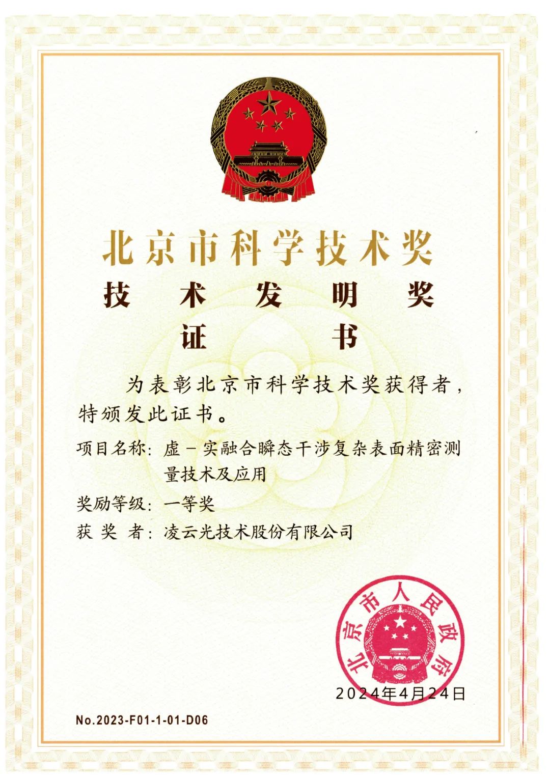 獲「北京市技術(shù)發(fā)明一等獎(jiǎng)」北京市科技大會(huì)暨科學(xué)技術(shù)獎(jiǎng)勵(lì)大會(huì)上,凌云光技術(shù)股份有限公司與合作單位聯(lián)合申報(bào)的“虛一實(shí)融合瞬態(tài)干涉復(fù)雜表面精密測量技術(shù)及應(yīng)用”榮獲2023年北京市技術(shù)發(fā)明一等獎(jiǎng)。