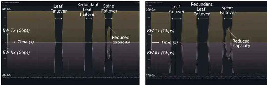 圖2顯示了我們對UCX和NCCL集體通信庫的測試結(jié)果。在該測試場景中,進(jìn)行了IB交換機(jī)故障模擬。圖表顯示了實(shí)驗(yàn)中涉及的一個(gè)DGX的IB界面上的帶寬(y軸)隨時(shí)間(x軸)的變化,對于all-to-all和all-reduce的微基準(zhǔn)測試。基準(zhǔn)測試在4個(gè)DGX之間和接口之間產(chǎn)生相同的流量。我們運(yùn)行微基準(zhǔn)測試,模擬故障,并監(jiān)控隨著時(shí)間的推移應(yīng)用程序的性能和狀態(tài)。在Spine故障期間,由于活動(dòng)鏈路的減少,系統(tǒng)的容量會(huì)降低,但應(yīng)用程序有可替代路徑可用,不會(huì)崩潰。啟用彈性方案后,可以在幾秒鐘內(nèi)恢復(fù)群集的全部性能(Spine故障切換)。在Leaf層發(fā)生故障(Leaf failover)的情況下,應(yīng)用程序崩潰,受影響的IB接口將保持離線狀態(tài),直到問題解決。啟用彈性方案后,應(yīng)用程序在中斷幾秒鐘(目前約為7秒,但有待優(yōu)化)仍能繼續(xù)運(yùn)行,系統(tǒng)的全部容量也能夠恢復(fù)。