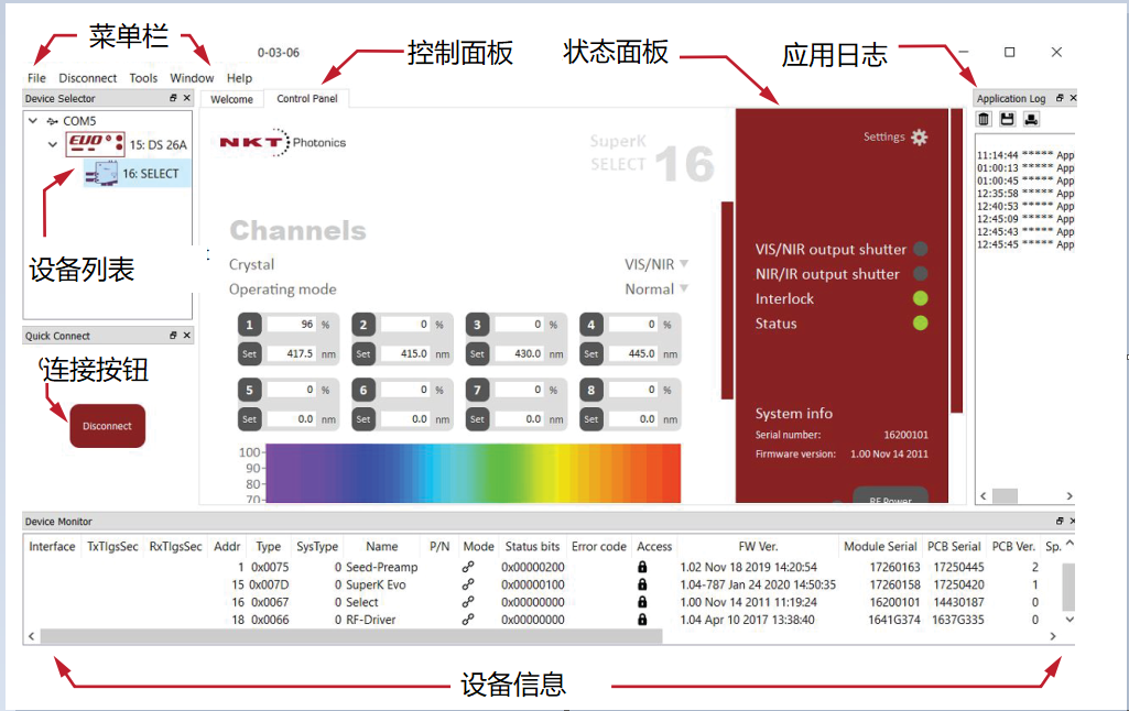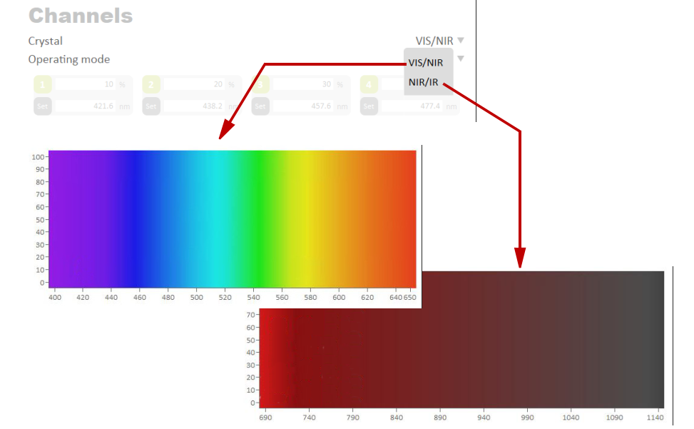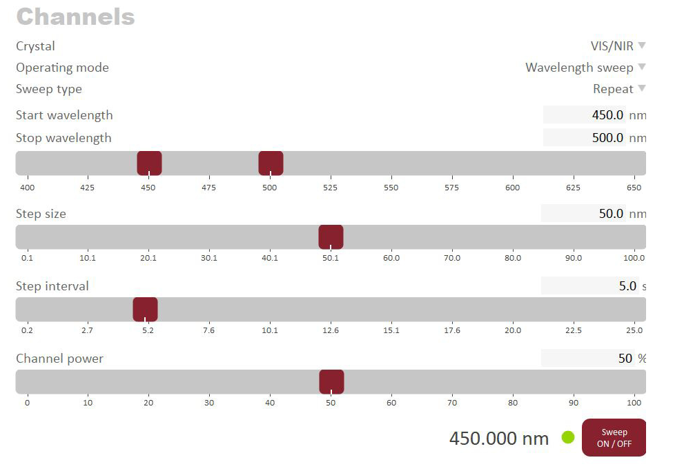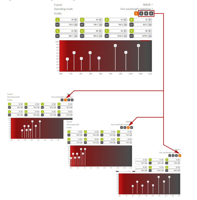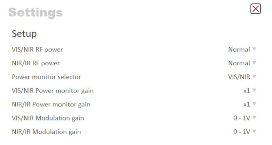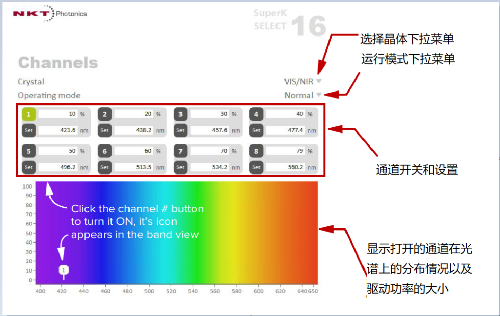 值得注意的是,在軟件設(shè)置選項中輸出晶體的RF功率模式都要選擇Normal模式,圖11所示,這個模式已經(jīng)在NKT工廠進行了上述射頻功率曲線矯正優(yōu)化,除非要交換某些硬件,否則不需要進一步優(yōu)化。只有當一個新的AOTF晶體或新的外部RF驅(qū)動器被添加到SELECT時,才使用Overdrive模式。在這些情況下,在工廠設(shè)置的最佳射頻功率校準曲線不再有效,可能需要進行新的校準。