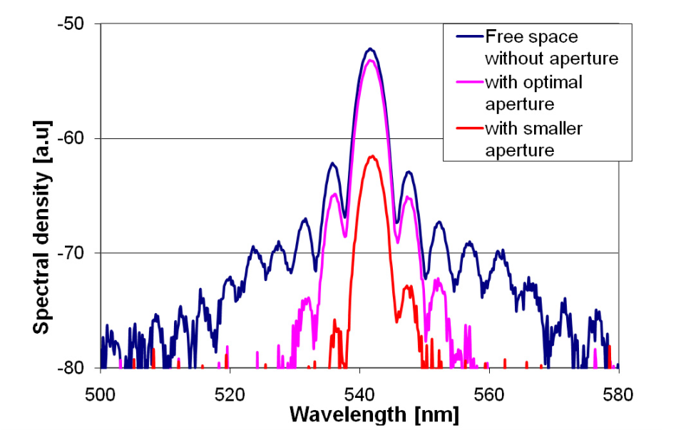 空間光輸出時:為了優(yōu)化輸出光束的質(zhì)量,通過一個小孔徑光闌對其進行濾波。圖9顯示了單個AOTF通道的光譜輸出與孔徑大小的函數(shù)關(guān)系。無孔時,主峰兩側(cè)各有多個側(cè)葉。減小孔徑的大小會降低旁瓣的功率。功率先在外瓣下降,然后在內(nèi)瓣下降,最后在主瓣下降。
