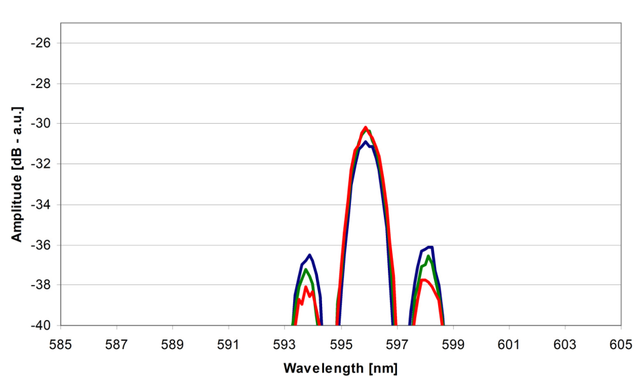在圖10中,紅色曲線是最優(yōu)的,而綠色和藍色曲線是當射頻功率水平超過最優(yōu)時的結(jié)果。旁帶功率增大,中心峰幅值反而減小。總之,邊帶和中心峰值之間的功率比由所選配置和運行參數(shù)決定。例如,所選擇的波長,射頻功率和所使用的射頻電纜長度。