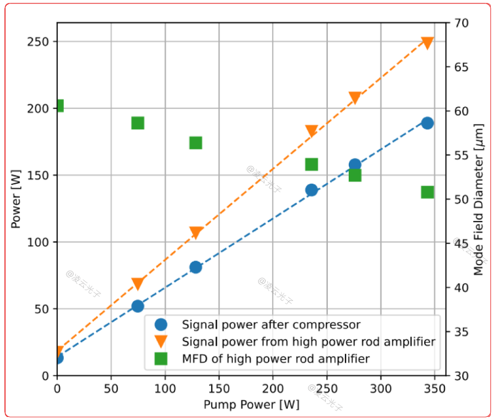 圖2▲經(jīng)過rod功率放大的壓縮前后的信號光功率及模場直徑,隨泵浦功率的變化