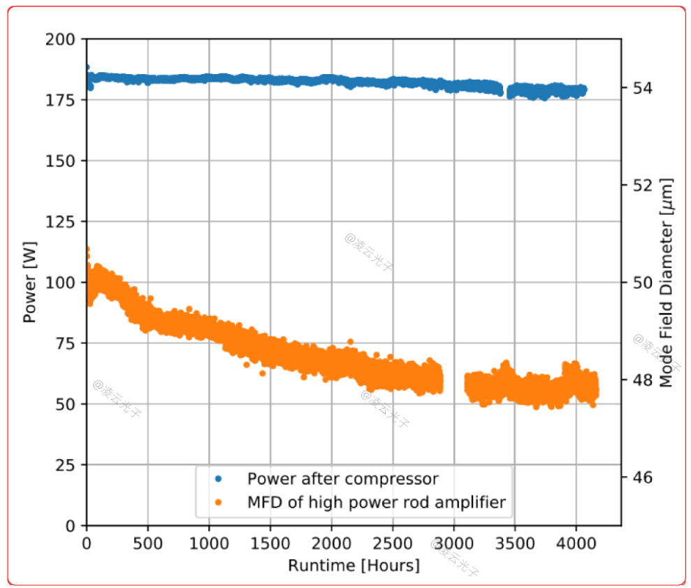 圖3▲經(jīng)過壓縮后的信號光功率,以及經(jīng)過rod功率放大后的模場直徑,隨時間的變化