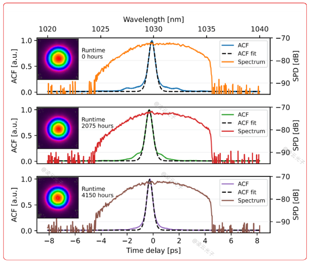 0時、2075小時、4150小時的壓縮后的自相關(guān)正割曲線、輸出光譜以及Amp5放大后的強(qiáng)度輪廓如圖4所示。再放大過程中積累的非線性相移導(dǎo)致了自相關(guān)曲線少量的強(qiáng)度邊帶,與再壓縮的雙曲正割曲線吻合。測試中大約每小時測試一次脈寬,CPA系統(tǒng)為實(shí)驗(yàn)臺上的自由空間,脈寬值對周圍環(huán)境敏感,盡管如此,大部分時間脈寬都在400fs以下,中位數(shù)約357fs。由于水冷控制在定溫25度,放大級沒有波動。