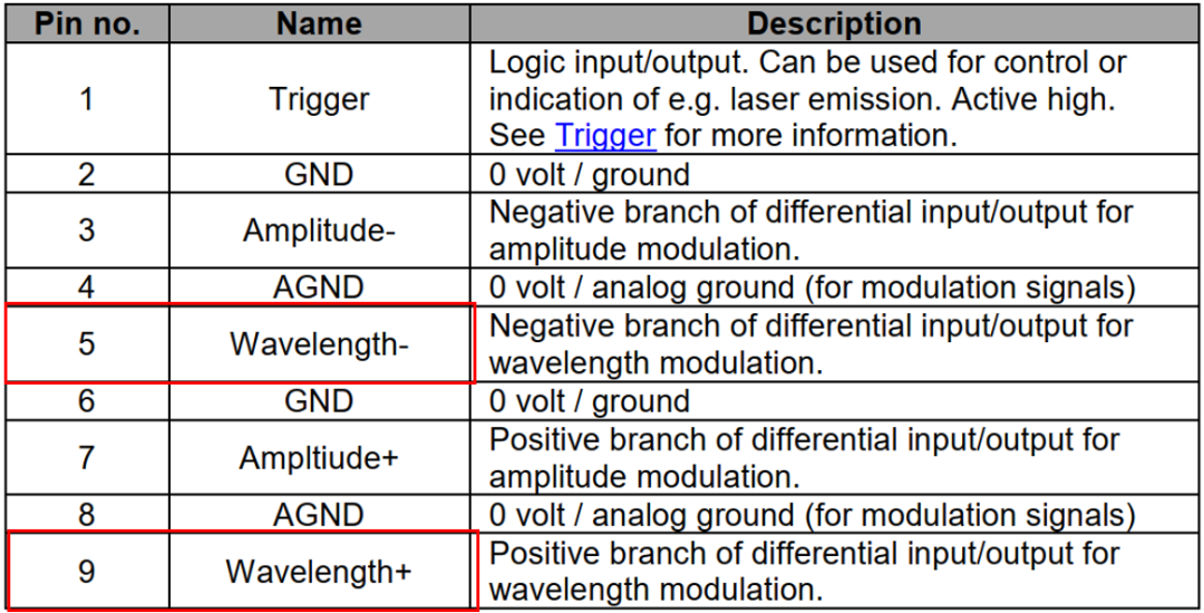 從表中可以看到5針對(duì)應(yīng)的是波長(zhǎng)往短波方向移動(dòng),9針對(duì)應(yīng)的是波長(zhǎng)往長(zhǎng)波方向移動(dòng)。2,4,6,8針都為地,其中的任意一個(gè)接地就可以,不用全都使用。1,3,7針腳的功能是激光器選配功能,不是所有機(jī)型都有。