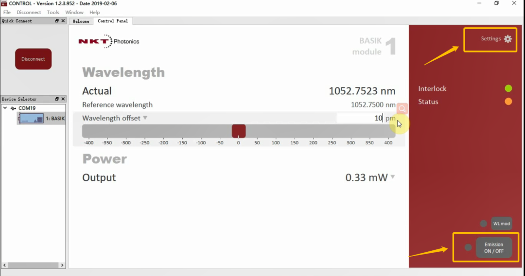 在Control Panel界面下,可調(diào)整波長(zhǎng)、功率(部分型號(hào)需選配),點(diǎn)擊Emission on可輸出激光,點(diǎn)擊WL mod開啟PZT波長(zhǎng)調(diào)制功能。