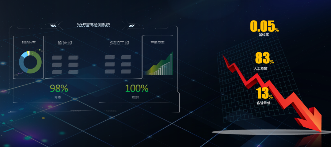 “雙碳”風(fēng)潮下,光伏賽道火熱,光伏玻璃行業(yè)競爭日趨激烈。據(jù)統(tǒng)計(jì),2022年新點(diǎn)火窯爐32座,新點(diǎn)火及復(fù)產(chǎn)的產(chǎn)能占全年總產(chǎn)能的46.85%,同時(shí)光伏玻璃售價(jià)逼近成本,質(zhì)效升級變得至關(guān)重要。在提質(zhì)增效的巨大壓力下,光伏玻璃龍頭企業(yè)(以下簡稱A公司)選擇與凌云光合作,共建智能工廠,成功實(shí)現(xiàn)產(chǎn)能升級,釋放83%目檢工人工作量。目前已穩(wěn)定運(yùn)行1年有余,無相關(guān)質(zhì)量投訴發(fā)生。
