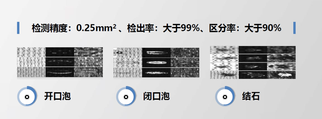 針對閉口泡、開口泡、結(jié)石缺陷,漏檢率0.05%
