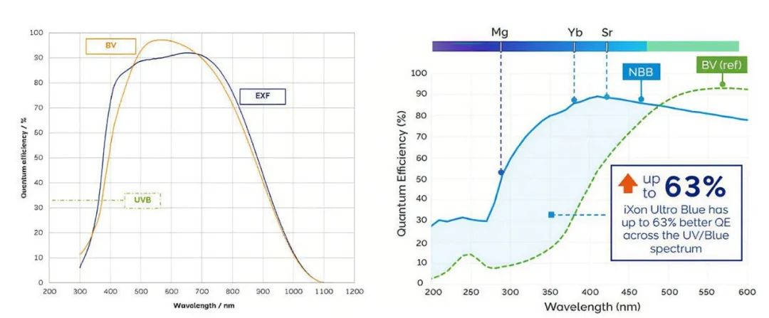 iXon系列EMCCD采用背照式傳感器,QE超過(guò)90%,提供從UV到NIR的廣泛波長(zhǎng)覆蓋。其中新品iXon Ultra Blue在藍(lán)光和近紫外具備極致的靈敏度,非常適合離子阱量子系統(tǒng)成像,尤其是鐿-370nm、鎂-285nm或鍶-422nm等離子。