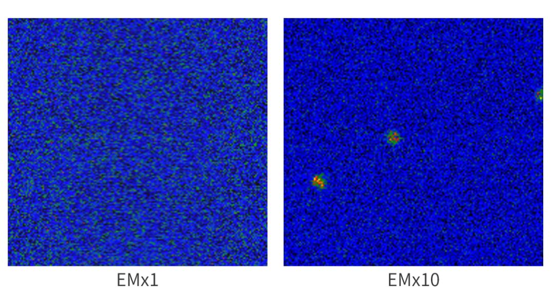 EMCCD對(duì)信號(hào)進(jìn)行數(shù)千倍的增益,原本難以與讀出噪聲區(qū)分開(kāi)的微弱信號(hào)能夠被放大到高于讀出噪聲,由于信號(hào)增益發(fā)生在讀出之前,實(shí)際上降低了相機(jī)的讀出噪聲水平,減少讀出噪聲對(duì)信號(hào)的影響,實(shí)現(xiàn)單光子級(jí)的靈敏度。即使在相對(duì)較低的EM增益設(shè)置下,有效讀出噪聲也能降低到小于1個(gè)電子(RMS)。