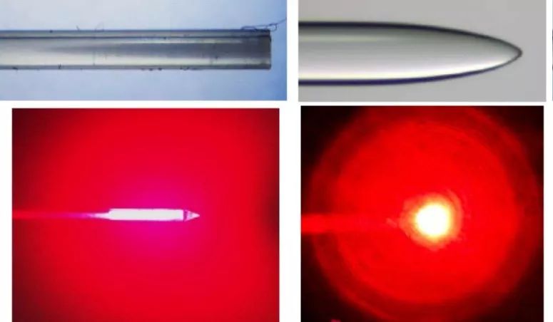 治愈癲癇或者小腫瘤腦外科,現(xiàn)在要將顱內(nèi)不需要的組織進(jìn)行熱破壞,光在光纖傳輸,是往一個(gè)方向傳,若是導(dǎo)管進(jìn)去定位后,只能將光方向的組織破壞掉,其他方向的還得繼續(xù)定位,來(lái)回移動(dòng),所以這一方案并不可行。而將導(dǎo)管頂部拉成錐形,打出來(lái)的光將是四散的,直接將定位附近的組織破壞掉,一步到位。如下圖,光纖尖端直徑由∞→10um,光就越向四面發(fā)散。