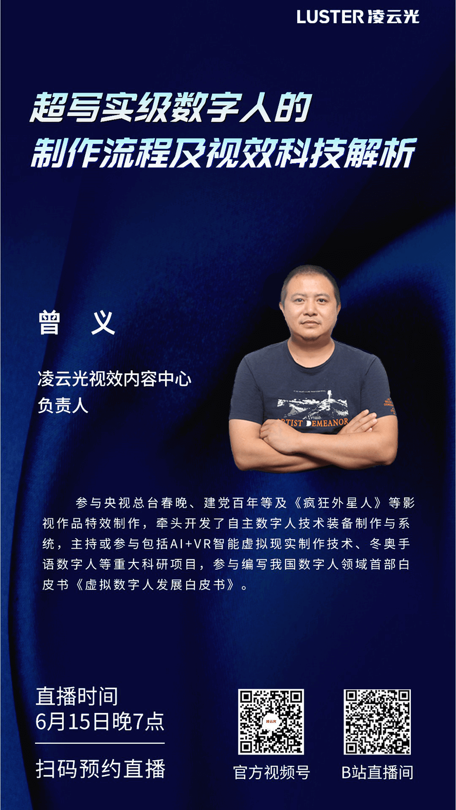 6月15日晚7點(diǎn),由凌云光重明視效工作室負(fù)責(zé)人曾義帶來直播分享,將圍繞《超寫實(shí)級(jí)數(shù)字人的制作流程及視效科技解析》,從超寫實(shí)級(jí)數(shù)字人內(nèi)容創(chuàng)作需求及難點(diǎn)、制作流程、視效科技和影視級(jí)應(yīng)用案例等方面進(jìn)行分享。