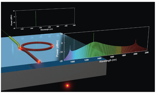 硅和鍺是強(qiáng)非線性材料,在中紅外波段大部分是透明的,光子集成電路在中紅外環(huán)境下,設(shè)計(jì)的無限靈活性可以顯著增強(qiáng)四波混頻、受激拉曼散射和布里淵散射等新型非線性效應(yīng)。例如,緊湊的超連續(xù)光譜和光頻梳已經(jīng)被證明使用非線性PICs。當(dāng)實(shí)驗(yàn)中使用近紅外激光器(波長(zhǎng)< 2.2um)時(shí),這些非線性效應(yīng)被波導(dǎo)中雙光子吸收(TPA)導(dǎo)致的自由載流子吸收和色散所衰減,這時(shí)可以通過使用發(fā)射2.5 μ m以上的中紅外激光器來解決。