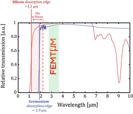 硅和鍺的相對(duì)透射率,硅中有害雙光子吸收(TPA)占主導(dǎo)地位的光譜區(qū),F(xiàn)emtum激光器是中紅外集成光子學(xué)的理想波段。