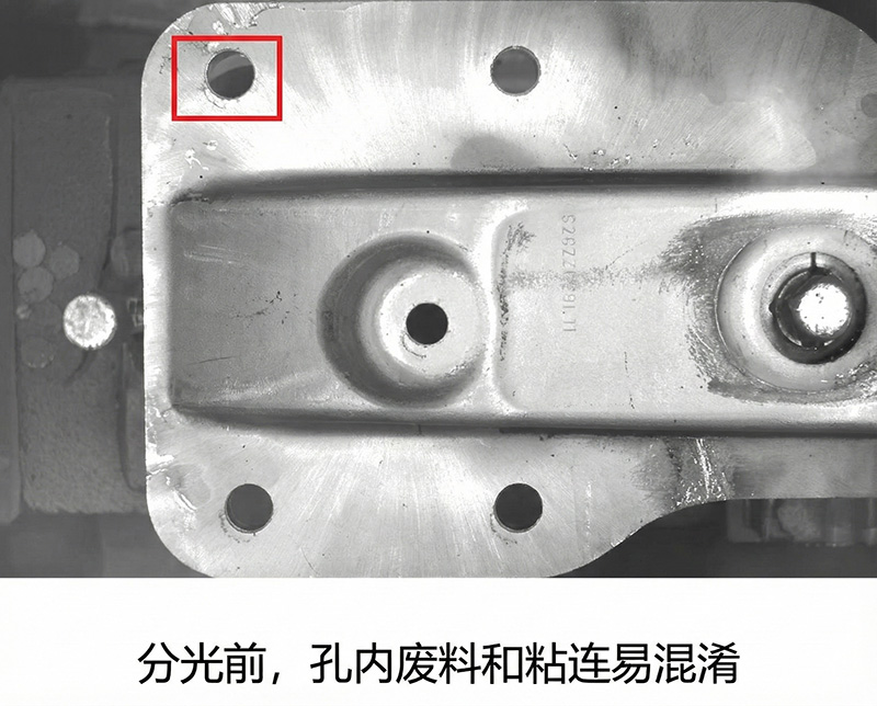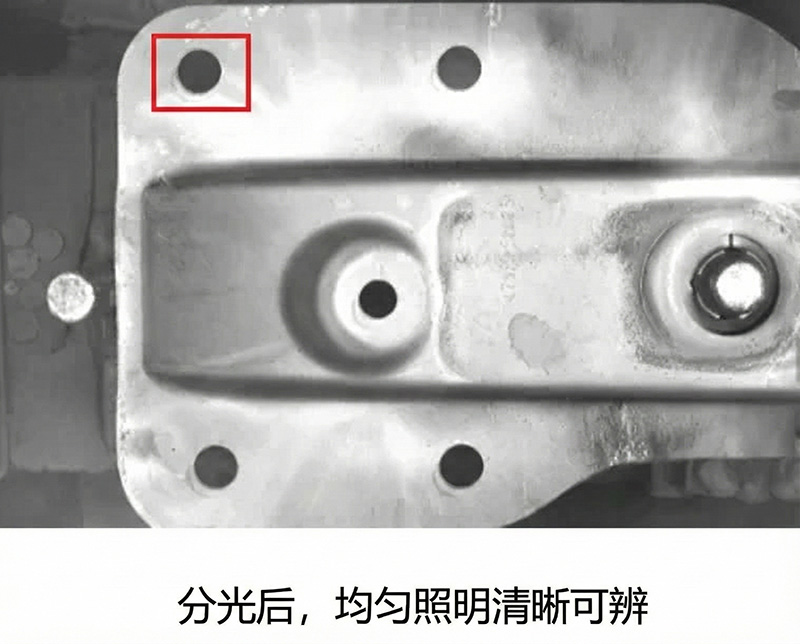工件(吸能盒、加強(qiáng)板)表面高反光,傳統(tǒng)成像易造成過曝和陰影干擾導(dǎo)致誤報(bào)(如孔內(nèi)廢料和切割粘連易混淆)。方案特別定制四分區(qū)AOI光源實(shí)現(xiàn)均勻照明,精準(zhǔn)檢測圓孔、方孔、異形孔、裙邊尺寸、主副孔位置關(guān)系等,精度達(dá)0.1mm,顯著降低過檢報(bào)錯(cuò)與批量質(zhì)量風(fēng)險(xiǎn)。