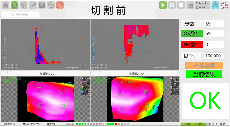 凌云光推出熱成型切割視覺檢測方案,采用雙6軸機(jī)械臂搭載定制2D+3D成像模組,以“視覺+AI+自動化”協(xié)同技術(shù),實(shí)現(xiàn)70余種零件切割前后的全流程高精檢測。切割前,檢測放置偏位與浮高翹曲,防止激光頭撞機(jī);切割后,實(shí)時(shí)檢出未切透、漏切、孔位偏差等缺陷,杜絕批量問題流出。方案支持固定工位與隨線在線全檢兩種部署方式,已成功應(yīng)用于國內(nèi)頭部汽車廠商多車型混線生產(chǎn)。