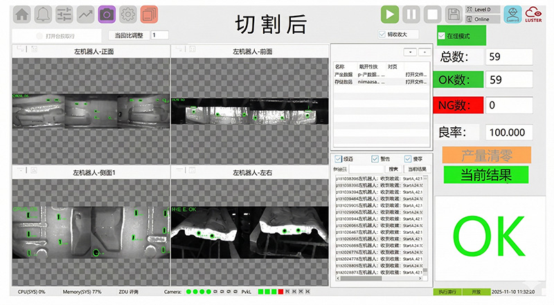 基于自研平臺專用軟件預(yù)設(shè)視覺檢測配方,兼容70余種工件(結(jié)構(gòu)件、加強(qiáng)件、吸能件及連接件等),針對常見工件產(chǎn)品切線,可實(shí)現(xiàn)小時(shí)級快速改機(jī)換型;操作界面簡潔直觀,產(chǎn)線技師可獨(dú)立完成運(yùn)維與參數(shù)切換。