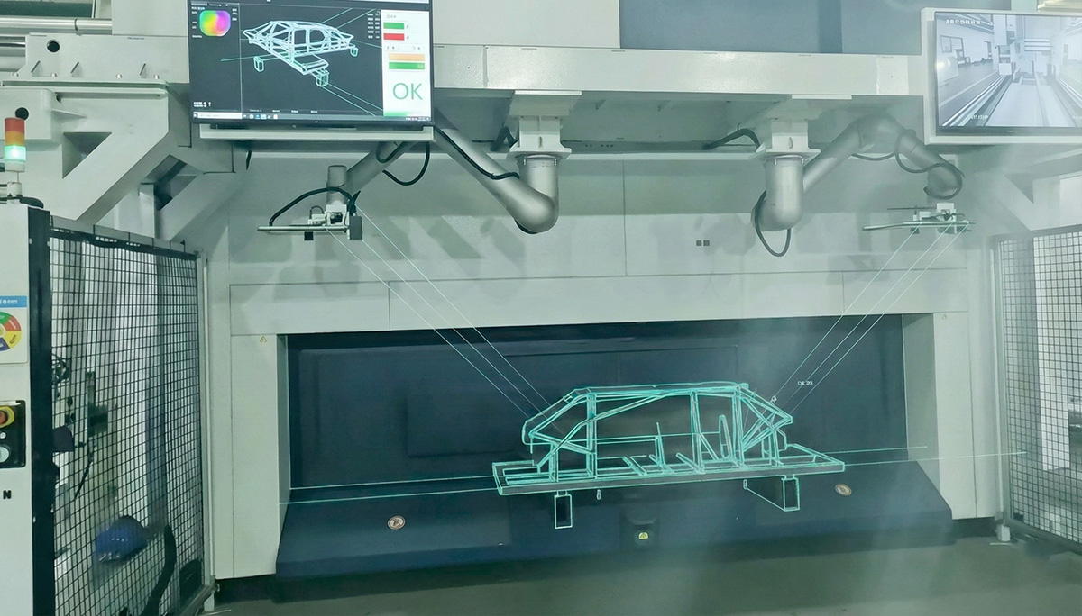 高溫成型鋼板經(jīng)激光切割后形成的B柱,需在節(jié)拍內(nèi)完成數(shù)十個(gè)孔位及輪廓邊線的全尺寸檢測(孔徑±0.1mm、孔位±0.2mm、邊線±0.7mm),該工序直接影響后續(xù)焊裝與整車總成裝配精度。