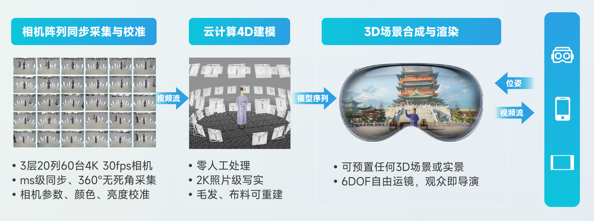 VR大空間等應(yīng)用使用本系統(tǒng)生成的“3D數(shù)字演員”,可省去人工修模、服裝制作、動(dòng)捕動(dòng)畫環(huán)節(jié),有力解決VR內(nèi)容中“缺真人”的問(wèn)題。